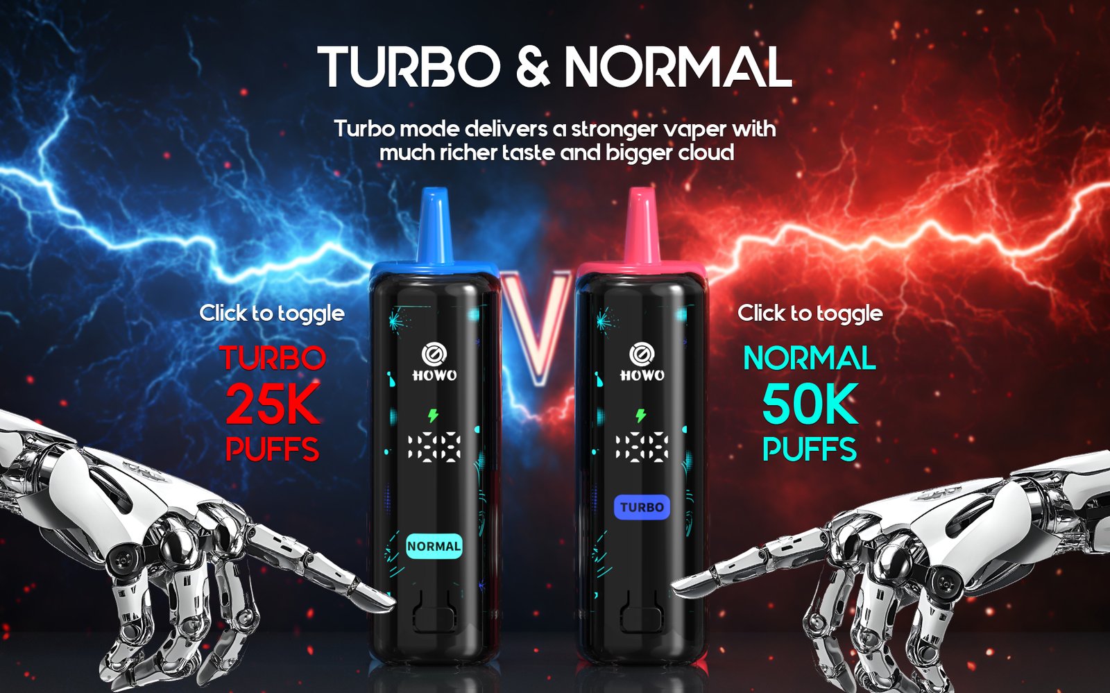 - Puffs: Up to 50,000 in Normal Mode / 25,000 in Turbo Mode